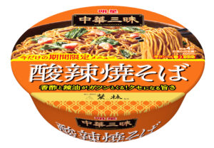 絶好調の「中華三昧」 酸辣湯麺シリーズから初の汁なしメニューが登場。「明星 中華三昧カップ 榮林 酸辣焼そば」(117g/麺85g、298円)を10月13日に新発売。