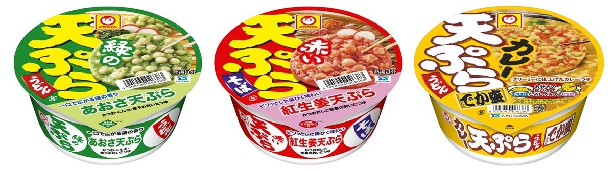 また同日、「マルちゃん 赤い天ぷらそば」(88g/63g)、「同 緑の天ぷらうどん」(90g/66g)をリニューアル発売。各236円。