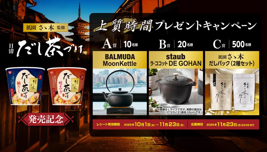 「日清カップメシ」シリーズの新商品として、京都・衹園に店を構える日本料理の名店「衹園さゝ木」監修のもと、上質なだしの味わいにこだわった「日清だし茶づけ」2品を9月15日に発売。新発売を記念して実施する今回のキャンペーンでは、「日清だし茶づけ」1食を含む「日清のカップメシ」シリーズの商品を購入した人の中から抽選で、〝和〟の雰囲気が漂う電気ケトル「BALMUDA MoonKettle」を10人に、ふっくらお米が炊ける鋳鉄製ホーロー鍋「staub ラ・ココット DE GOHAN Sサイズ (12cm)」を20人に、さらに「衹園さゝ木」こだわりの「衹園さゝ木 だしパック (2種セット)」を500人にプレゼントする。
