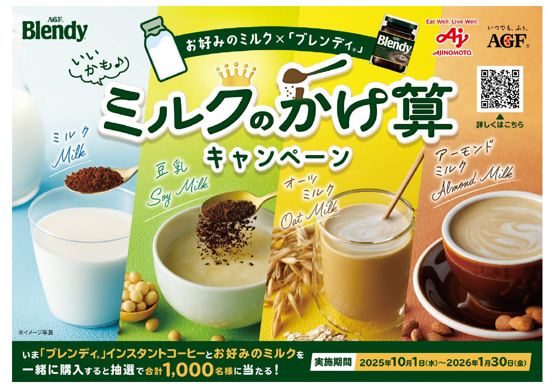 味の素AGFは、「ブレンディ インスタントコーヒー」の新たな提案として「ブレンディ ミルクのかけ算キャンペーン」を10月1日~2026年1月30日まで実施する。