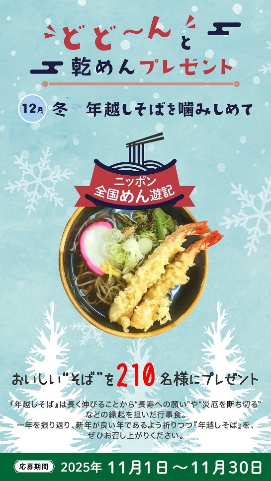 全国乾麺協同組合連合会(全乾麺)は、2023年から通年の取り組みとして「ニッポン全国めん遊記-どど~んと乾めんプレゼント-」を展開。今回の令和7年度第4弾は、年末の年越しそばをテーマにした「冬・年越しそばを噛みしめて」と題し、全国各地の自慢の乾めんを210人に贈る。応募期間は11月1日~30日。