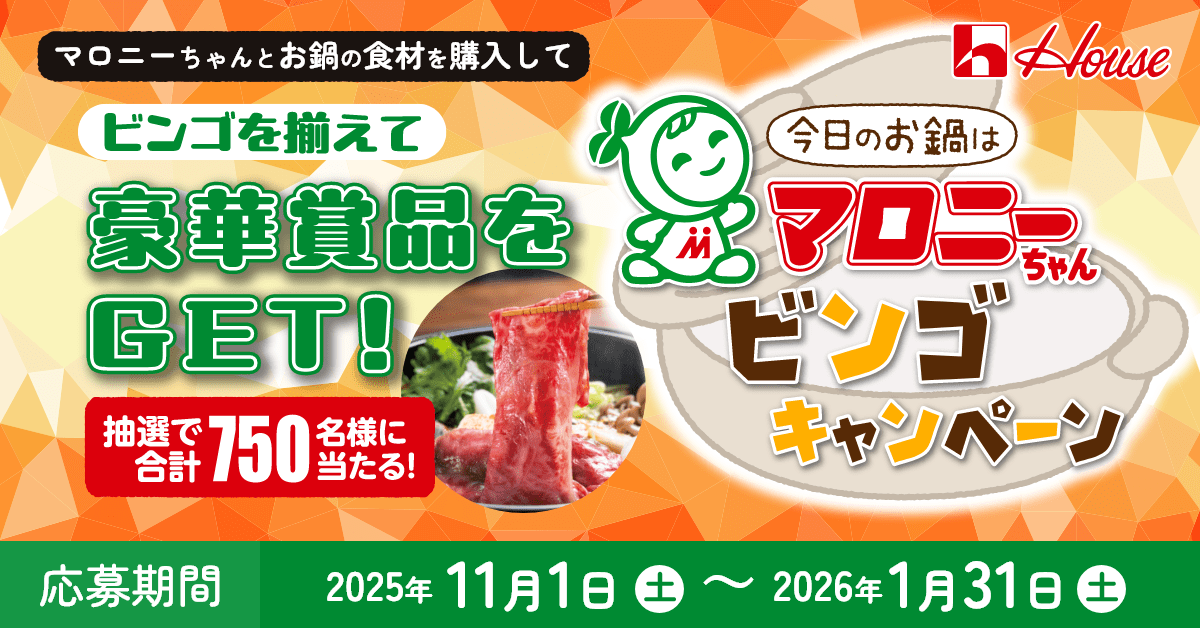 ハウス食品は、ちゅるちゅる・もちもち食感の「マロニーちゃん」を対象とした「ビンゴを揃えて豪華賞品をGET!今日のお鍋はマロニーちゃん、ビンゴキャンペーン」を11月1日~2026年1月31日まで実施する。期間中に「マロニーちゃん」と鍋関連食材を含む税込550円以上のレシートを用意して、専用サイトでビンゴを揃えて応募するとグルメギフトブランド牛(8千円分が30人)など豪華賞品が抽選で750人に当たる。