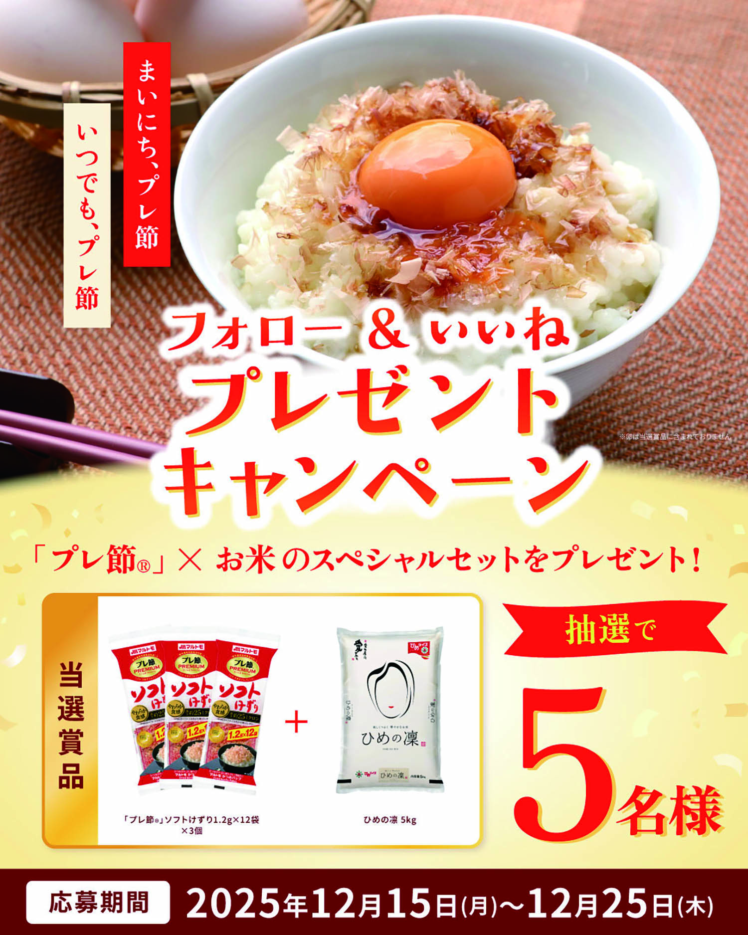 マルトモは、公式Instagramにて、プレミアムかつお節「プレ節Ⓡ」と愛媛のブランド米「ひめの凛」が当たるフォロー&いいねキャンペーンを開催している。2025年10月から放映中の「プレ節Ⓡ」新CMを記念した企画で、炊き立てのご飯に「プレ節Ⓡ」をのせて味わう、シンプルながらぜいたくな食体験を提案する。