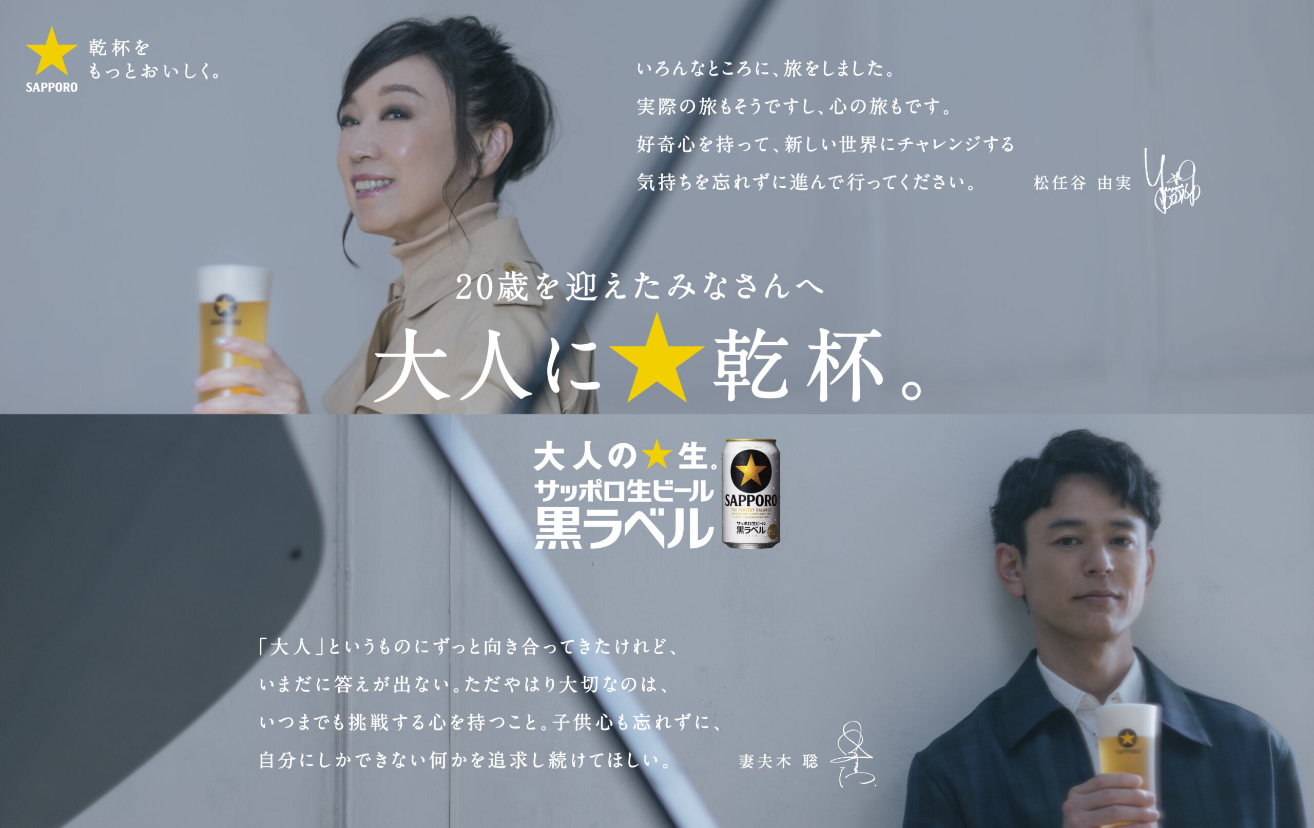 サッポロビールは、人気ブランド「サッポロ生ビール黒ラベル」のスペシャルメッセージ企画として、「大人に☆乾杯。」をテーマにしたビジュアルを、全国主要駅の広告やWEBで1月5日から期間限定で公開する。