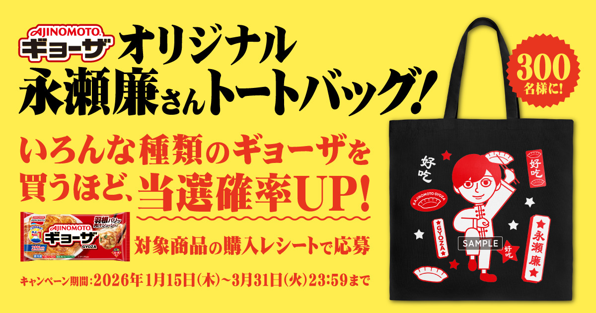 味の素冷凍食品は、「AJINOMOTO BRANDギョーザ」シリーズを対象に、抽選で300人にオリジナル永瀬廉さんトートバッグが当たるプレゼントキャンペーンを、1月15日~3月31日まで実施する。