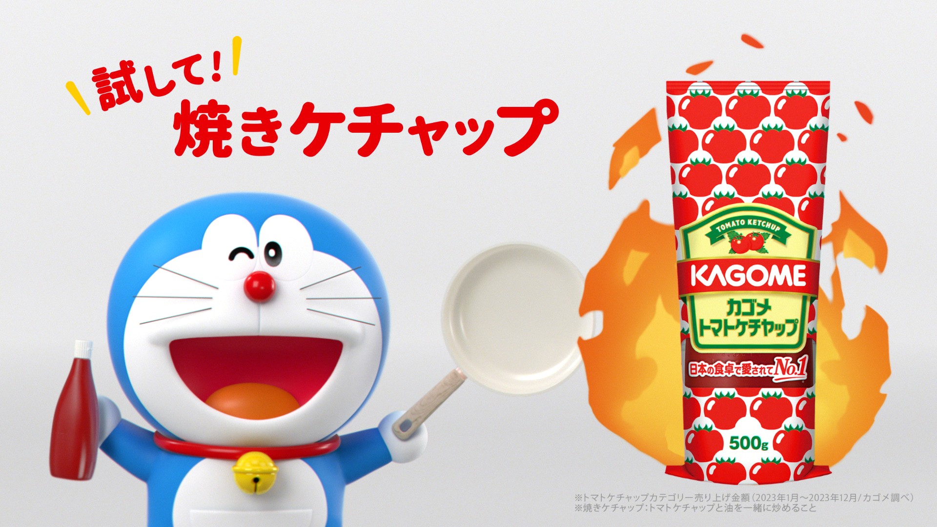 カゴメは定番商品であるカゴメトマトケチャップの新たな楽しみ方として、油と一緒に炒めることでコクと旨味が増す「焼きケチャップ」を提案している。この魅力を広く伝えるため、国民的キャラクターのドラえもんを起用した新CM「焼きケチャたまごはん」篇と「焼きケチャたまごパン」篇を制作し、3月18日よりWEB公開、5月からテレビでも順次放映する。