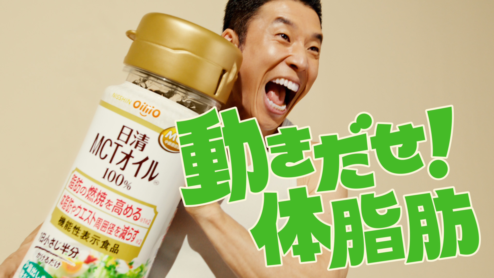 日清オイリオグループは、機能性表示食品「日清MCTオイルHC」の新テレビCM「動きだせ!体脂肪」篇(15秒)を制作し、3月19日から全国で放映する。アンバサダーを務めるなかやまきんに君が出演し、オリジナルソングとコミカルな動きで商品の特長を訴求する。