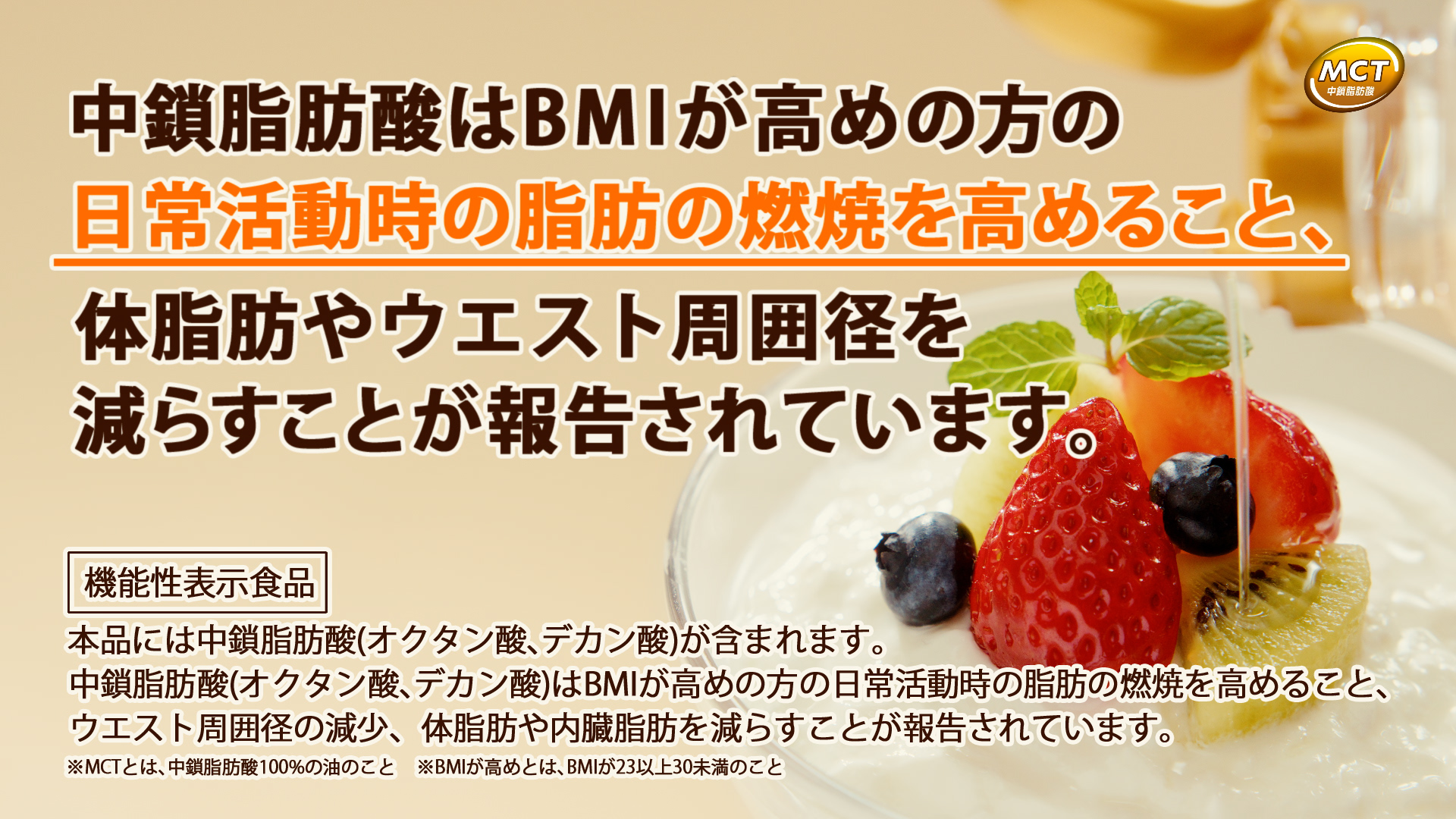 同商品はMCT(中鎖脂肪酸油)100%の食用油で、味やにおいが少なく、料理や飲み物の味を変えずに使用できるのが特長。中鎖脂肪酸が日常活動時の脂肪燃焼を高め、体脂肪や内臓脂肪、ウエスト周囲径の減少に役立つことが報告されている機能性表示食品として展開している。