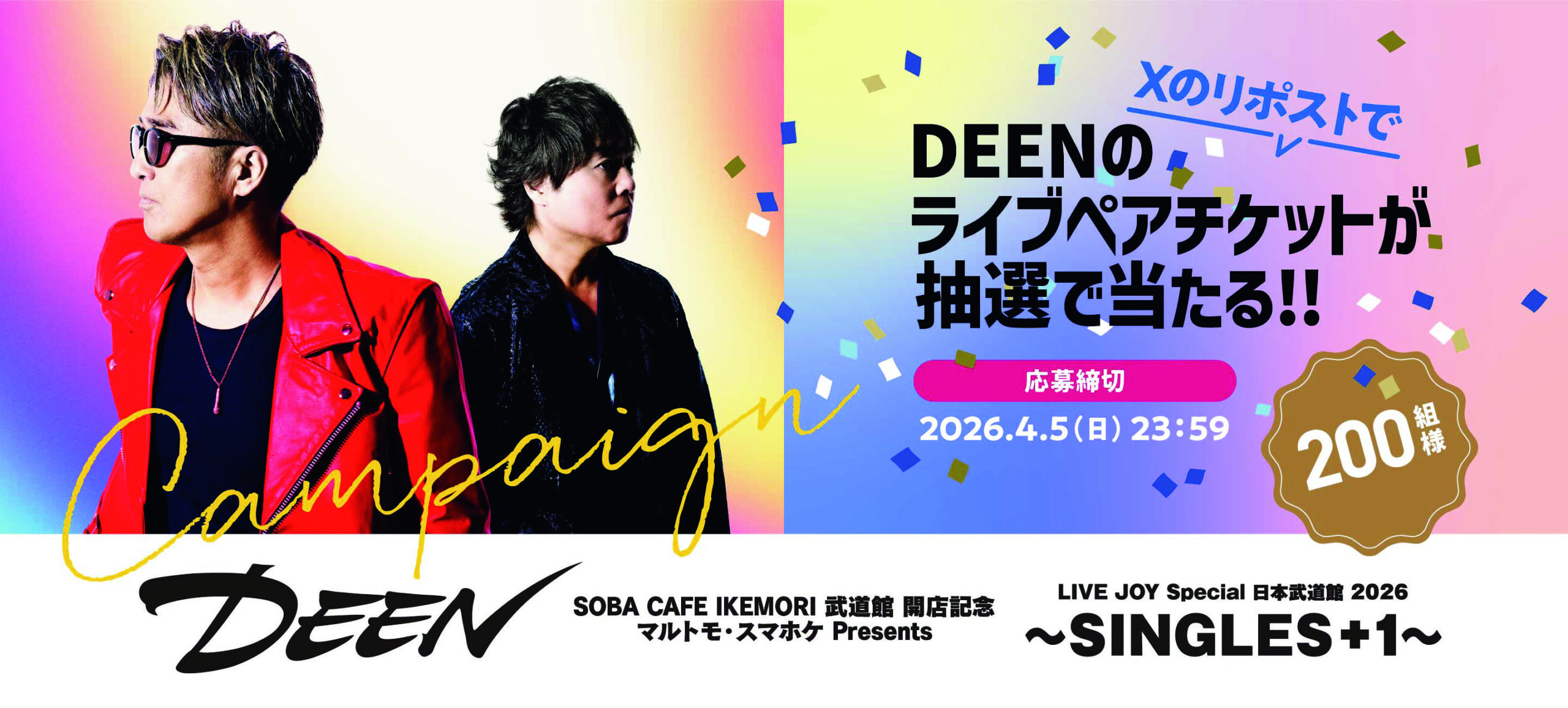 マルトモは、人気バンドDEENが4月30日に開催する日本武道館公演への協賛を決定した。あわせて、公式Xにてペアチケットが200組に当たるキャンペーンを開始した。