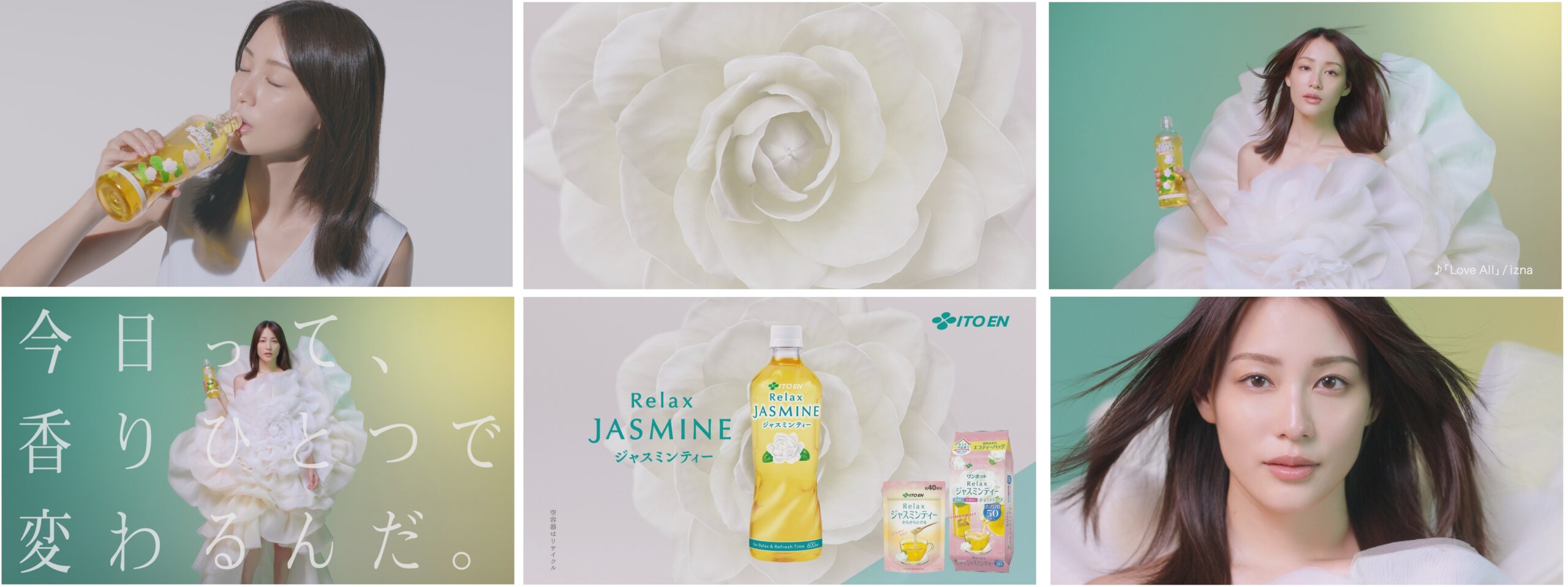 伊藤園は、ジャスミンの心地よい香りとすっきりとした後味が女性に人気の「Relax JASMINE」の新テレビCM「今日って、香りひとつで変わるんだ。」篇において、CMタイアップソングとして書き下ろされた、グローバルガールズグループ「izna」初となる日本オリジナル楽曲「Love All」を採用し3月16日から放映している。