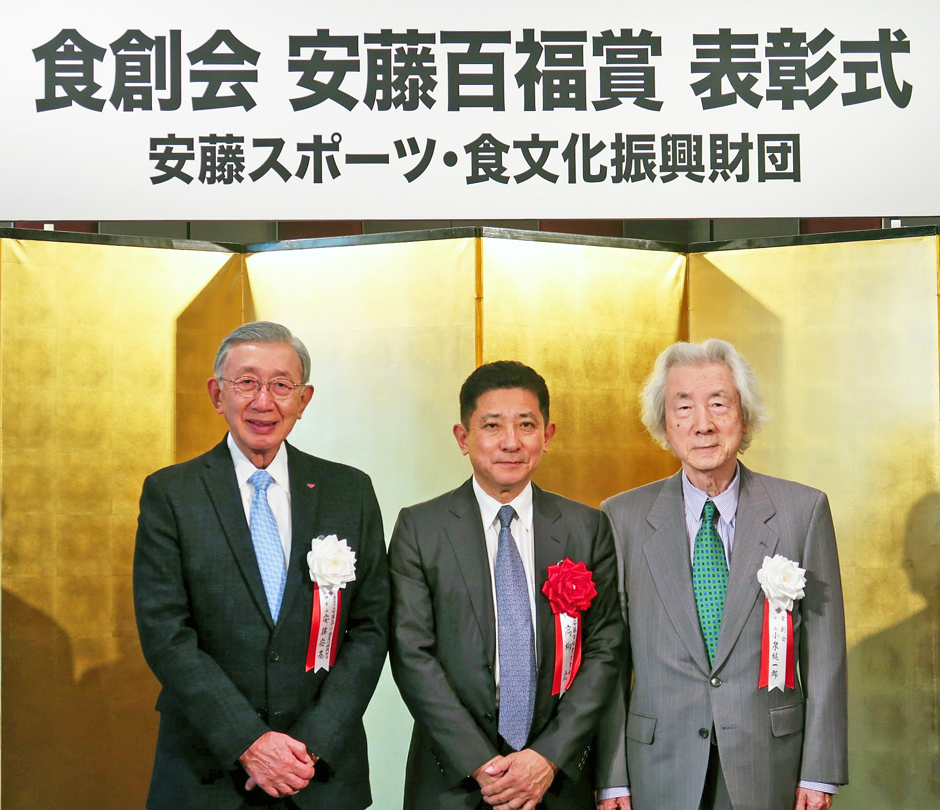 表彰式に先立つ記者会見には、食創会会長の小泉純一郎元首相、同財団理事長の安藤宏基氏、高柳氏の3人が登壇。安藤理事長は財団と食創会の活動を紹介するとともに、高柳氏の研究成果を評価し、今後のさらなる活躍とノーベル賞への期待を示した。小泉会長は自身の人生を振り返りながら、健康や社会における食の重要性を強調した。