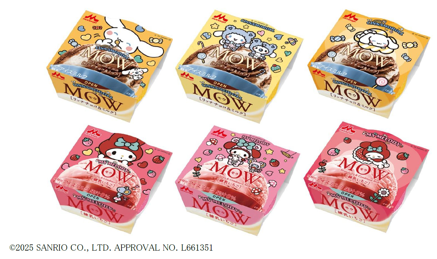 森永乳業は、サンリオの人気キャラクター「シナモロール」「マイメロディ」とコラボレーションした「MOW(モウ)リッチチョコ&ミルク」「MOW(モウ)練乳いちご」を1月12日から数量限定発売する。