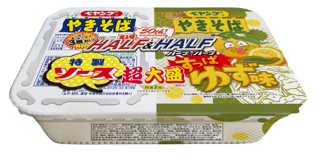 国産素材のだしの旨みを利かせた「tabeteだし麺」シリーズと、まるか食品「ペヤング」のコラボレーションで、「tabeteだし麺×ペヤング超大盛やきそばハーフ&ハーフすっぱゆず味」(227g、298円)を11月4日から数量限定で発売。発売50周年を迎えた「ペヤングソースやきそば」をオマージュし、「tabeteだし麺 高知県産ゆずだし塩らーめん」風にアレンジした。特製ソースと、酸味のあるすっぱい柚子ソースとのハーフ&ハーフ、さらには混ぜ合わせれば3つ目の味わいも楽しめる。