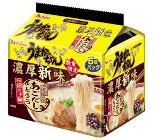 袋麺「うまかっちゃん濃厚新味」のバラエティー商品「同 あごだしとんこつ」(84g/麺70g、136円)を11月3日から近畿・中国・九州および沖縄地区で数量限定発売。5個パックもある。長崎県産焼きあごをスープに使用した、あごだしの旨みを利かせた濃厚な豚骨スープに、細カタ麺を合わせた。