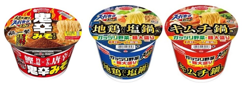 「スーパーカップ」ならではの大盛りのめんに加え、野菜もたっぷり摂れる一人鍋風のラーメンを開発。「キムチ鍋風ラーメン」は、魚醤や唐辛子を利かせた濃厚キムチ鍋風スープで最後まで食べ飽きないクセになる味わい。かやくはキャベツ、白菜キムチ、人参、ねぎ、韓国産の唐辛子入り。「地鶏だし塩鍋風ラーメン」は、野菜の旨みに地鶏だしを合わせた塩鍋風スープが食欲をそそる。かやくはキャベツ、大豆そぼろ、玉ねぎ、人参、ねぎ入り。