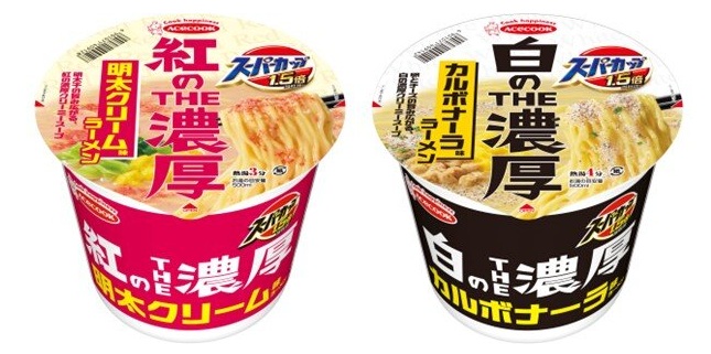 1月19日、カップ麺「スーパーカップ 1.5倍 紅のTHE濃厚 明太クリーム味ラーメン」(107g/麺90g)、「同 白のTHE濃厚 カルボナーラ味ラーメン」(101g/同)を新発売。各256円。
