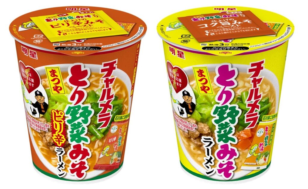 1月19日、カップ麺「明星 チャルメラカップ とり野菜みそラーメン」(71g/麺55g)、「同 とり野菜みそピリ辛ラーメン」(70g/同)を新発売。各236円。
