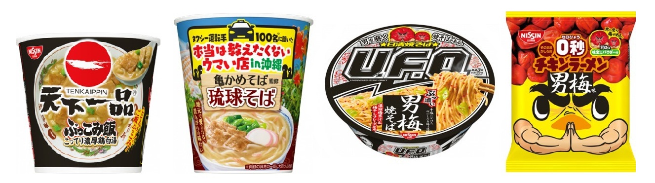 1月26日、ノーベル製菓「男梅」とコラボした「0秒チキンラーメン 男梅味パウダー付」(79g/麺75g、136円)、「日清焼そばU.F.O.ぶっ濃い男梅焼そば」(101g/麺85g、236円)を新発売。