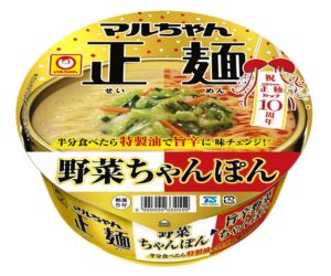 「マルちゃん正麺 カップ」シリーズ発売10周年を記念した期間限定商品「同 野菜ちゃんぽん⇒旨辛野菜ちゃんぽん」(110g/麺75g、278円)を新発売。