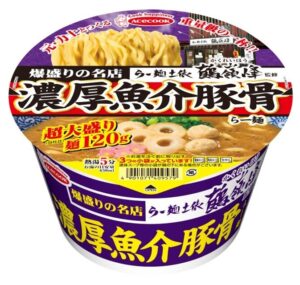 元・力士が営む爆盛りの人気店「らー麺土俵鶴嶺峰」監修で、「爆盛りの名店」シリーズ第2弾として投入。麺はしっかりとした弾力と滑らかさを併せ持つ角刃の太麺。スープはポークをベースに、鰹の旨みと玉ねぎの甘みを加えた魚介豚骨醤油味。別添の液体スープでラードの旨みを加えることで、店舗の特長である濃厚な味わいを再現。具材は豆腐鶏団子、麩、ねぎ、魚肉練り製品入り。