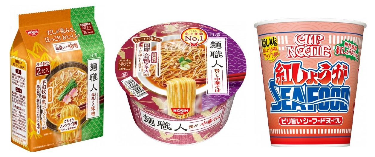 さらに袋麺シリーズでは「日清麺職人 塩糀コク味噌 2食パック」(156g/120g、230円)を投入。塩糀の香りが広がる味噌スープに〝平田牧場産ポーク〟のエキスを使用し、豚だしの旨みを生かしたコク深い味わい。全粒粉入りノンフライ中太ウェーブ麺は昆布の旨みを練り込み、すすりやすい長さに設計している。
