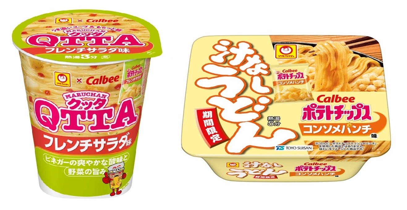 3月9日、カップ麺「マルちゃん 汁なしうどん コンソメパンチ味」(108g/麺90g)、「MARUCHAN QTTA フレンチサラダ味」(79g/61g)を期間限定で新発売。各236円。カルビー「ポテトチップス」発売50周年を記念したコラボ企画として投入する。