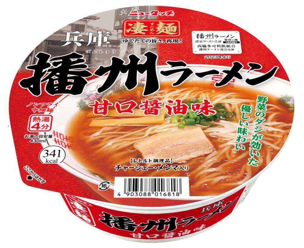 3月9日、「ニュータッチ 凄麺 兵庫播州ラーメン」(123g/麺60g、278円)をリニューアル発売。