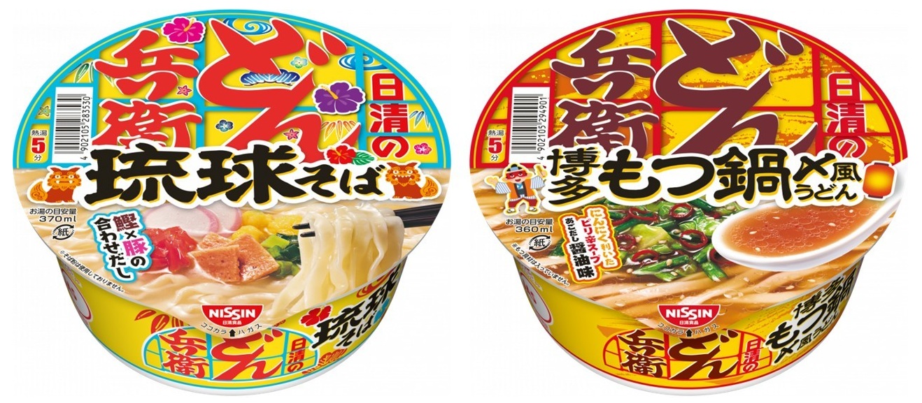 「日清のどん兵衛 博多もつ鍋〆風うどん」(95g/麺66g)、「同 琉球そば」(79g/同)を新発売。各248円。