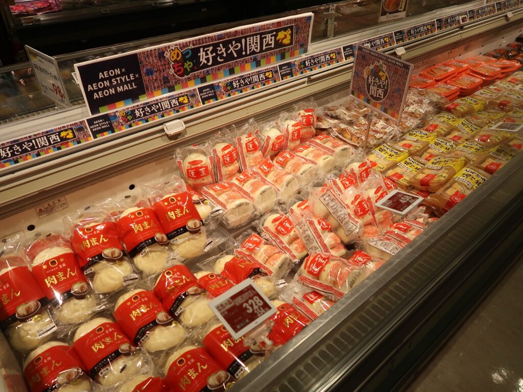 企画は大きく4つに分けられ①関西ゆかりの品ぞろえ②行政・地域イベント③集客イベント④インバウンド向け企画を内包する。イオン堺北花田店では大阪府産の水菜や小松菜、和歌山県産の柿、岸和田漁港の鮮魚などのほか、日清食品やエースコックの即席麺、蓬莱本館の豚まんなどが勢ぞろい。