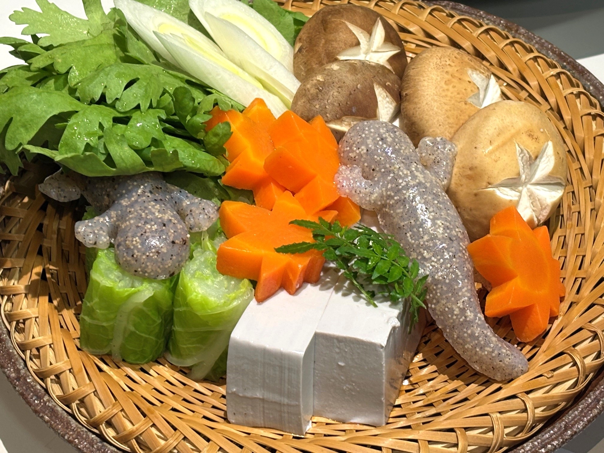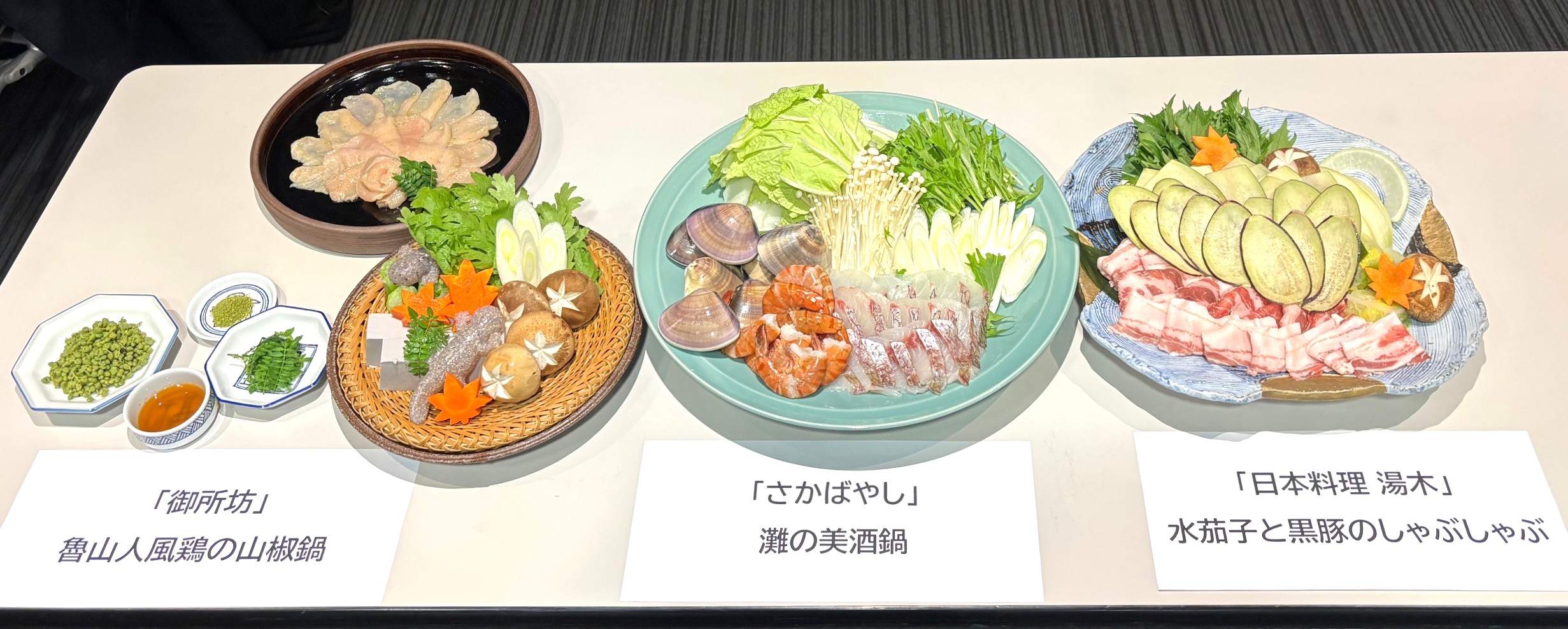 有馬温泉の名店「陶泉 御所坊」は北大路魯山人ゆかりのユニークな鍋を提案。同地区の名産と言えば山椒。有馬温泉観光協会が神戸市北区で山椒を育成し、有馬温泉の名品として訴求するプロジェクトに同店も賛同。今回の鍋具材の鶏肉には、ガストロパック(減圧加熱調理器)を使用し山椒水を注入、鶏肉自体が山椒風味を内包する。また魯山人が「変わった食べ物でおいしいものは山椒魚」と『魯山人味道』に記しており、かつては中国や日本でサンショウウオが食べられていたことから、有馬山椒と鶏肉で山椒魚の鍋の再現を目指した。