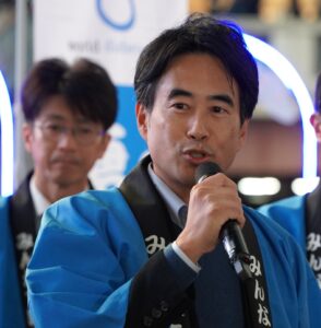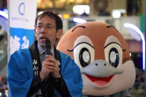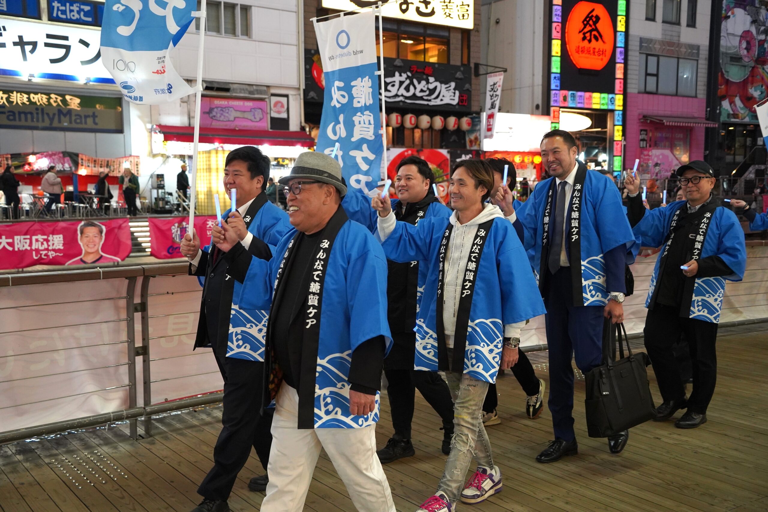 11日のイベントには江崎グリコ・梅林卓也健康事業マーケティング部長、道頓堀商店会・上山勝也会長(串かつだるま会長兼社長)、大阪府・もずやん副知事、大阪府・脇川智浩健康推進室長、ほか同商店会11人、なんばマルイのスタッフが参加。