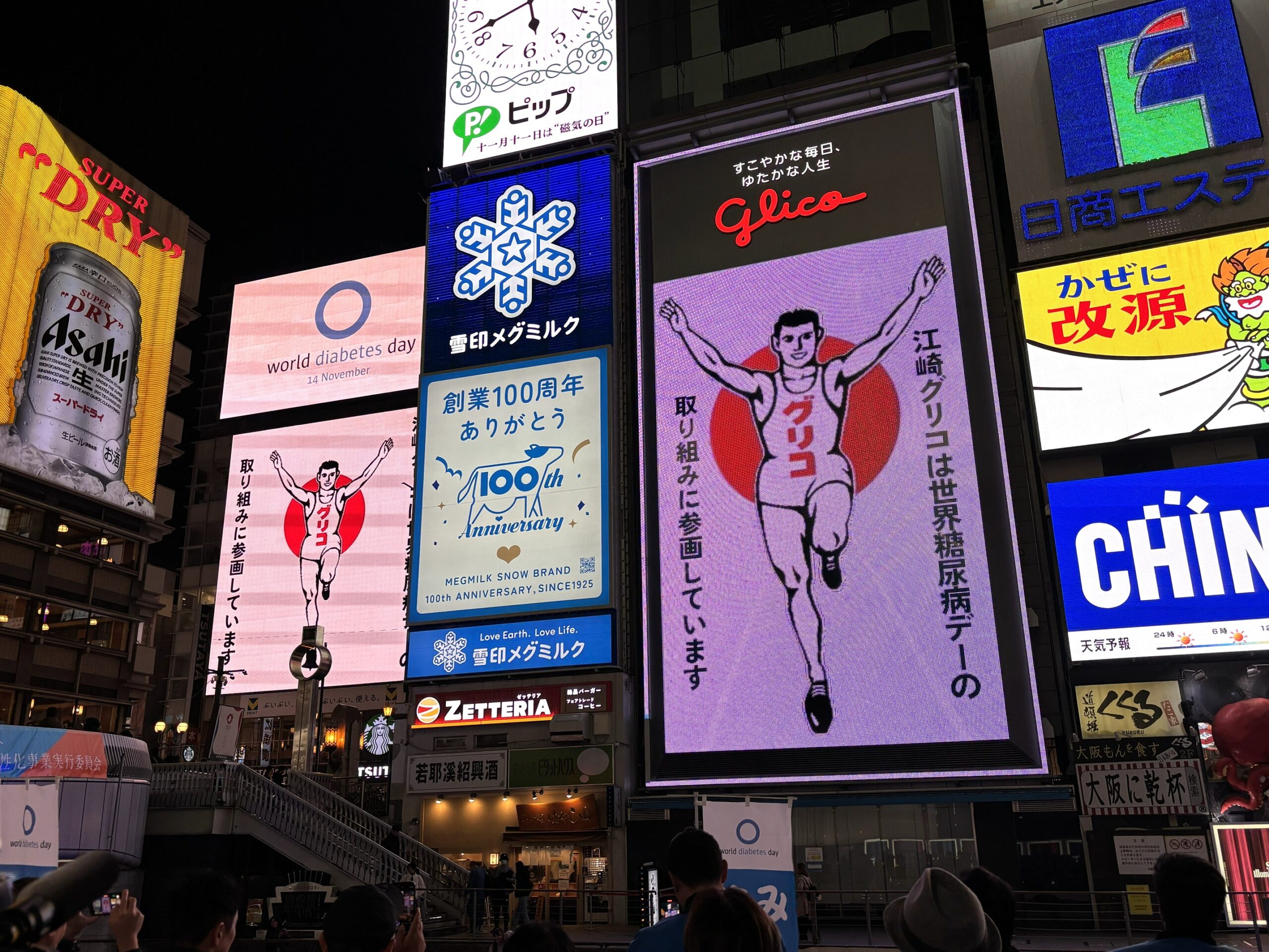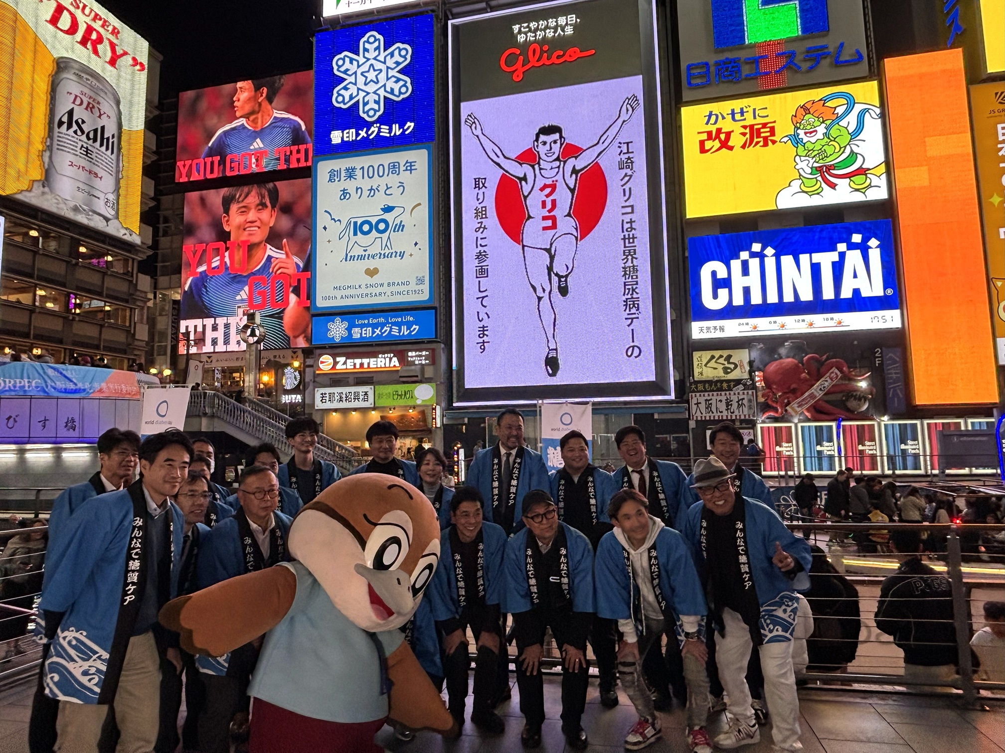 江崎グリコは11月14日の世界糖尿病デーに合わせ、大阪府、道頓堀商店会、なんばマルイ、ロート製薬、ロートウェルコートとともに“糖質ケア”をテーマとした4つの啓発活動を順次展開。11日には道頓堀で串かつだるまのライトアップ、関係者によるパレード、グリコサイン特別映像点灯式などが行われた。