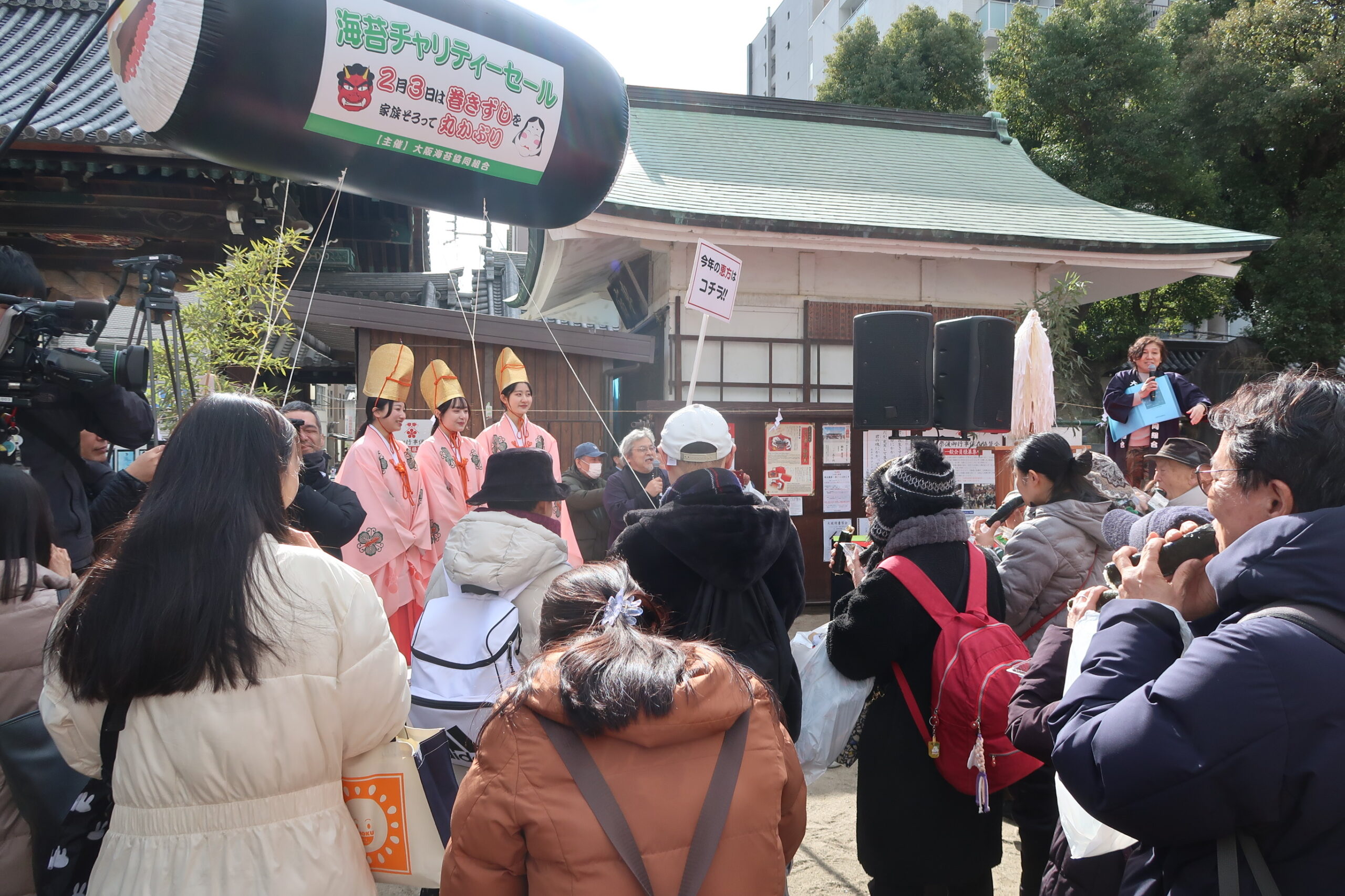 大阪海苔協同組合(村瀬忠久理事長)は2月3日、節分の恒例行事「海苔チャリティーセール」を大阪天満宮で開催した。今年で50回目となる同イベントでは、名物行事の「巻き寿司千人いっせい丸かぶり」も実施され、境内は多くの来場者でにぎわった。