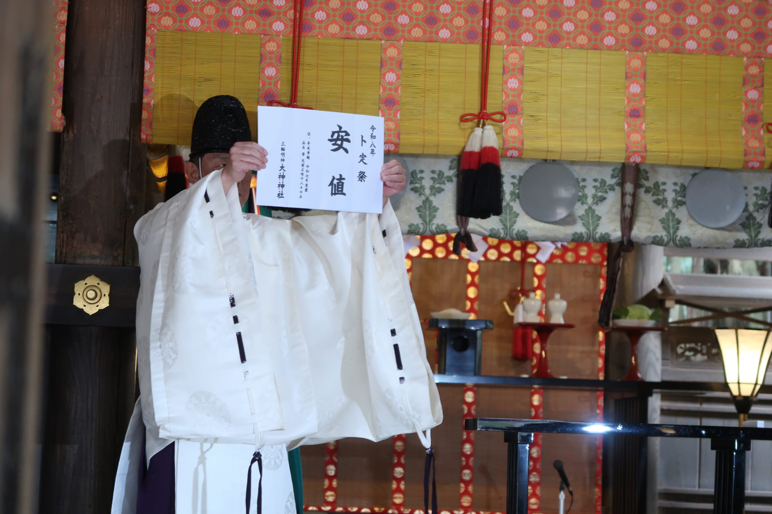 奈良県三輪素麺工業協同組合(小西幸夫理事長)と奈良県三輪素麺販売協議会(池田利一会長)は2月5日、大神神社(奈良県桜井市)で、2026年の三輪素麺の卸値を占う神事「卜定祭」を執り行った。今年の神託は「安値」を示し、「誉18㎏木箱」は前年より600円高の1万2600円に決定した。