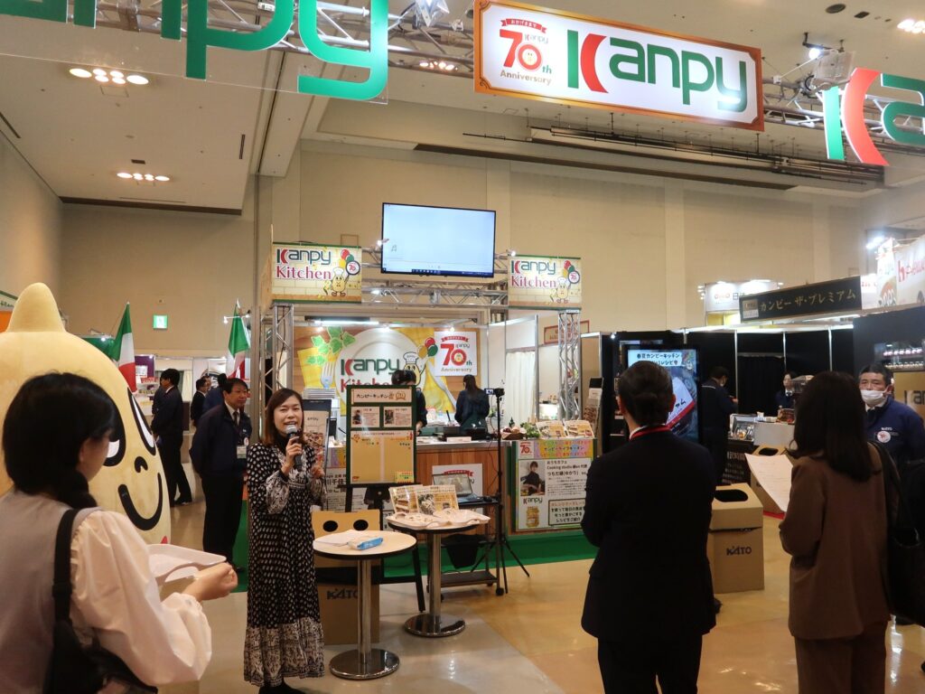 会場入り口に設置したパネルで、10%増量した紙カップ入り製品の4月からの発売、SNSプレゼントキャンペーン、6~8月に実施するマストバイキャンペーンを告知。また、中川千佳子さん、つちだ縁(ゆかり)さんを講師に招いたライブキッチンで、カンピー商品(700gジャム)を使用したメニューやSNSで反響の高かった魅力的なレシピなどを紹介。さらにフルーツ缶・あんこ・ゆであずきを用いた涼味メニューや新製品の「鮭中骨水煮」「ライトツナフレーク8缶パック」など、食卓の幅を広げる素材感提案も。