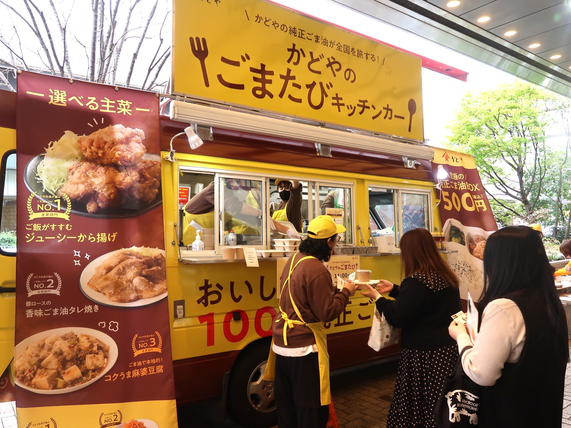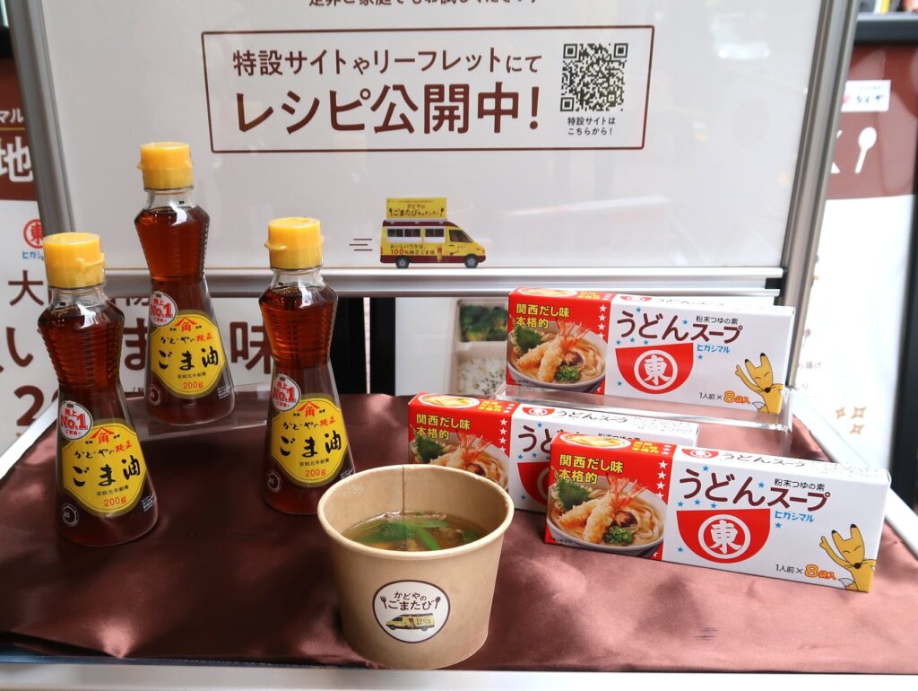 「純正ごま油のまだ知られていないおいしさや使い方を発見する」ことをテーマに、2月20日からスタートした「かどやのごまたび」。ごま油の価値を実感できる弁当メニューを引っさげ全国各地(9カ所)をキッチンカーで巡る企画で、創業の地・小豆島に始まり、福岡、広島を経て、3月19~20日は大阪に登場。関西地域の老舗の醤油メーカーで、人気商品の「うどんスープ」を展開するヒガシマル醤油とコラボしたスープメニューを販売している。