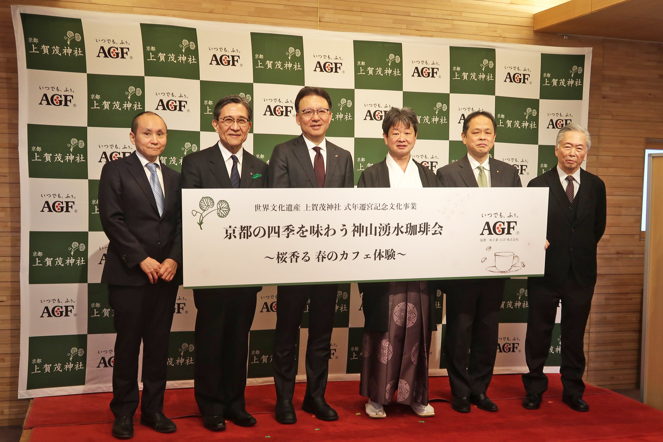 味の素AGFは、世界文化遺産の上賀茂神社(京都市北区、正式名:賀茂別雷神社)と連携し、期間限定イベント「京都の四季を味わう神山湧水珈琲会~桜香る 春のカフェ体験~」を4月7日~9日に開催した。初日の7日にはメディア向け体験会を行い、味の素AGF・島本憲仁社長や上賀茂神社の高井俊光宮司、京都府・鈴木一弥副知事、京都市・松井孝治市長、山田松香木点・山田英夫社長、亀屋良長・吉村良和社長が登壇した。