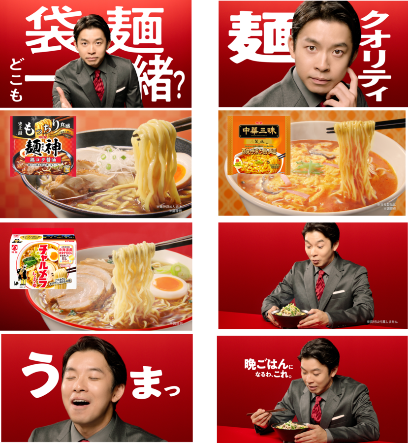 同社は2025年秋冬戦略として「麺の明星 主食麺宣言!」を掲げ、「うまい麺とスープ、好きな具材で食卓へ」をキャッチコピーに、家庭の主食として袋麺を提案。「明星 麺神」「明星 中華三昧」「明星 チャルメラ」など、麺の品質にこだわった主力袋麺ブランドを「主食麺シリーズ」と位置付け、〝主食になるくらいうまい麺〟として、好みの具材を加えることで立派な主食となることを紹介していく。