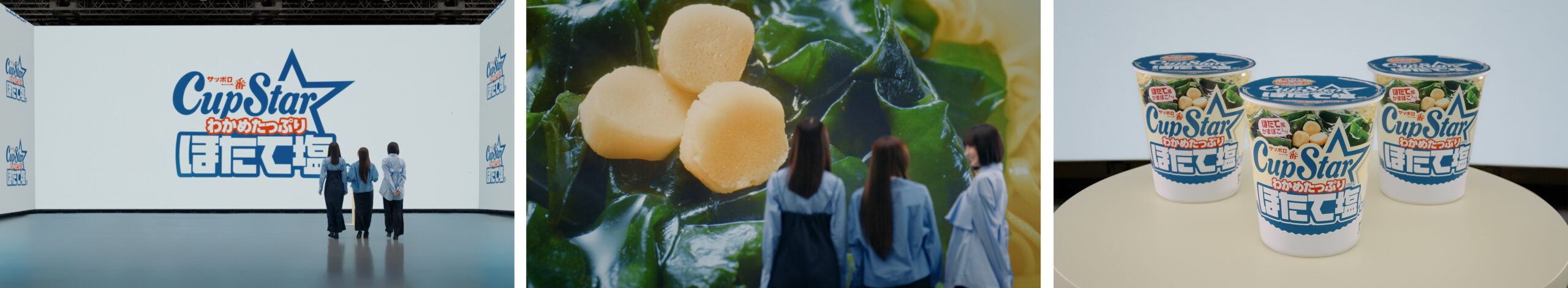 サンヨー食品は、「カップスター」の新商品「ほたて塩味」の発売に合わせ、新テレビCMを10月9日から全国で放映開始。CMにはおなじみ乃木坂46のメンバー、遠藤さくらさん、賀喜遥香さん、井上和さんがブルーの衣装で登場し、巨大なスクリーンを前に、具材のわかめやほたてかまぼこを目の前に、新商品のおいしさを伝える。