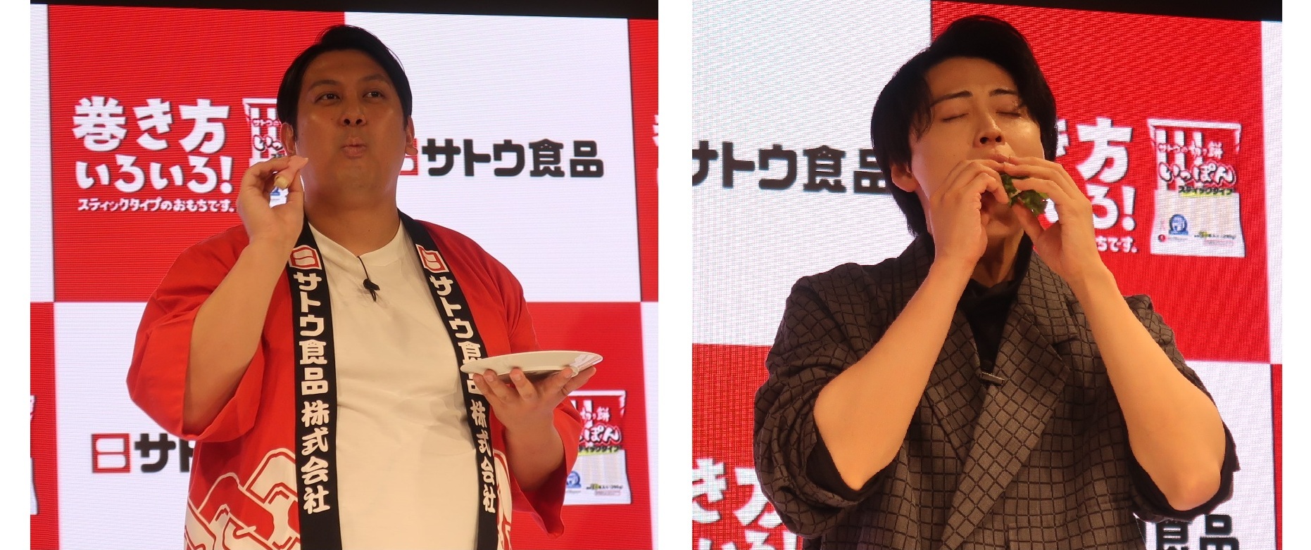 新CM発表会&試食会では、小学生時代の正月には「サトウの切り餅」が山積みされていて、1度に20個を完食したというジャンボさんと、餅肌のような白い肌もネタにする池田さんが手巻き餅を楽しみながらねばりのある笑いを展開。ちなみにジャンボさんが「11月11日は一年間で最も記念日が多い日」と小ネタを披露する場面もあったが、日本記念日協会によると同日は3番目(70件)。なお1位は8月8日(77件)、2位は10月10日(71件)となっている。