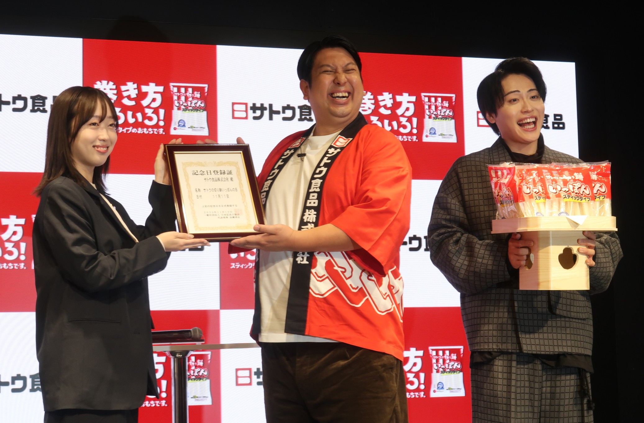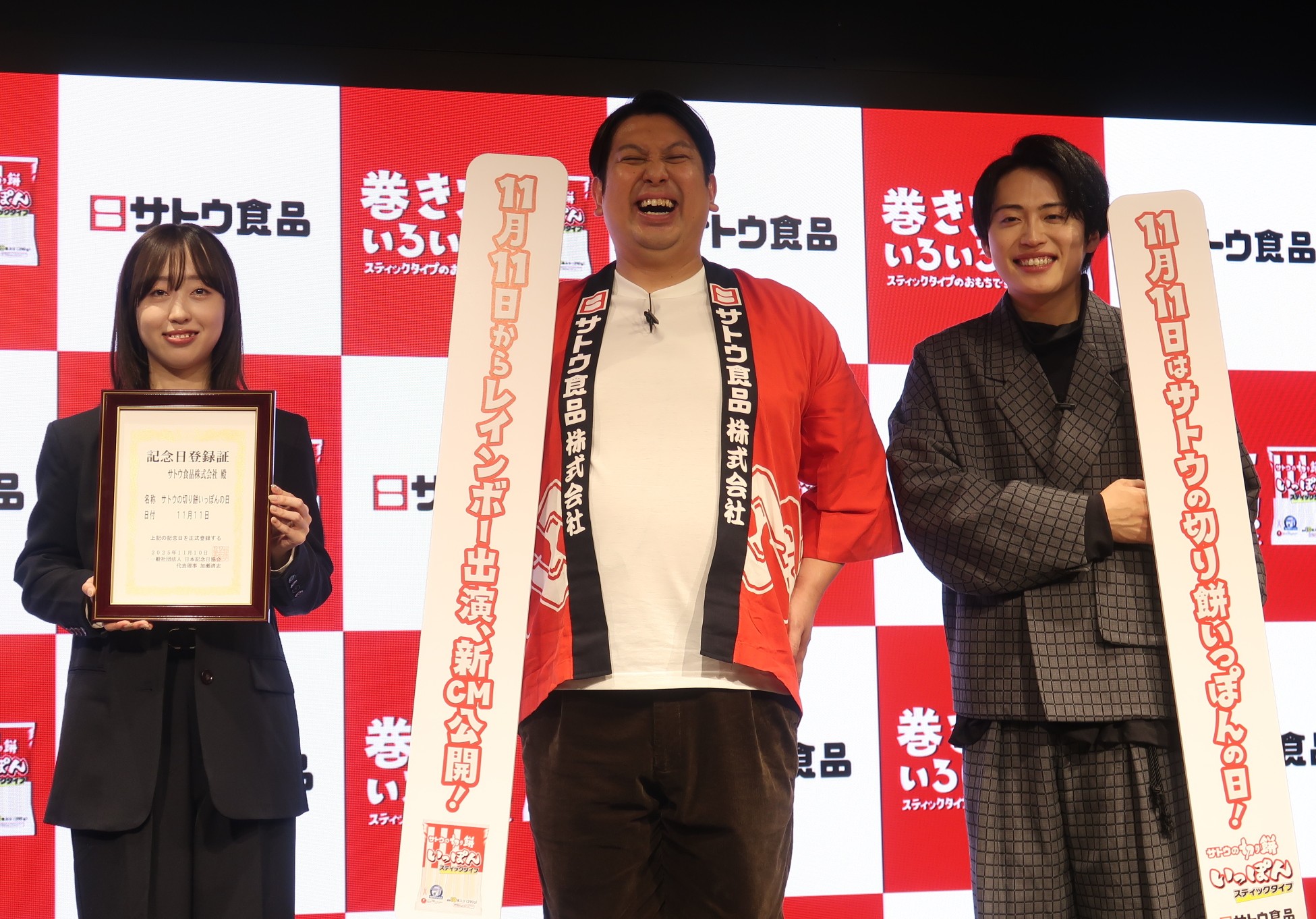 サトウ食品は、11月11日を「サトウの切り餅いっぽんの日」に制定し、お笑いコンビ・レインボーを起用した新ウェブCMを制作。前日には都内で新CM発表会&試食会が行われ、CMに出演するお笑い芸人のレインボーが登場した。