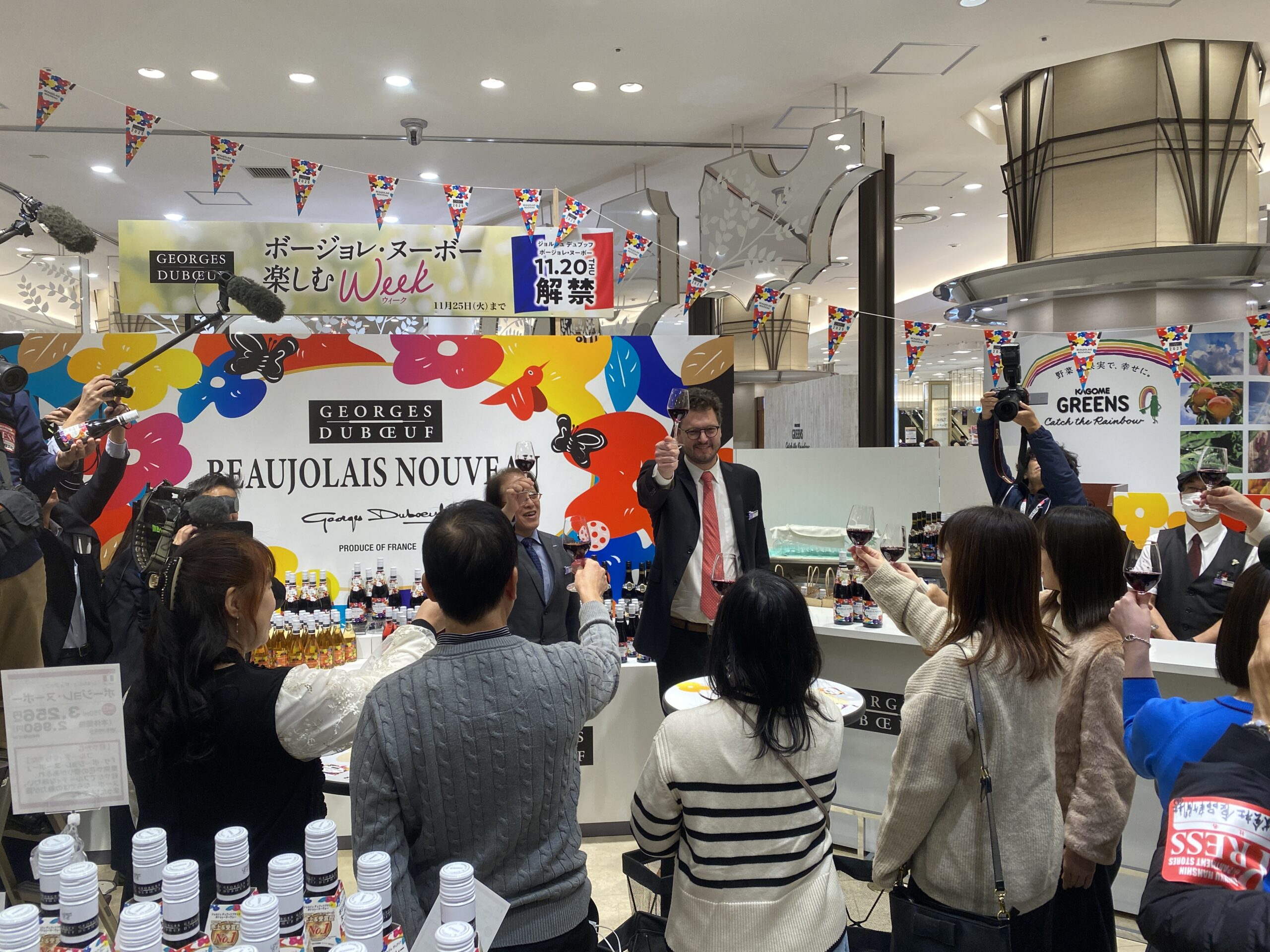 11月20日、2025年のボージョレ・ヌーボーが解禁。サントリーは同日、阪急うめだ本店で解禁イベントを開催し、日本国内で販売数量トップの「ジョルジュ デュブッフ」社の生産者、アドリアン・デュブッフ・ラコンブ取締役が登壇した。出来ばえについて「今年は太陽に恵まれた当たり年。凝縮した甘濃い味わいが特徴で、〝5のつく年は優れたビンテージになる〟というジンクス通りの素晴らしい仕上がり」と語り、来店者に今年の魅力を伝えた。