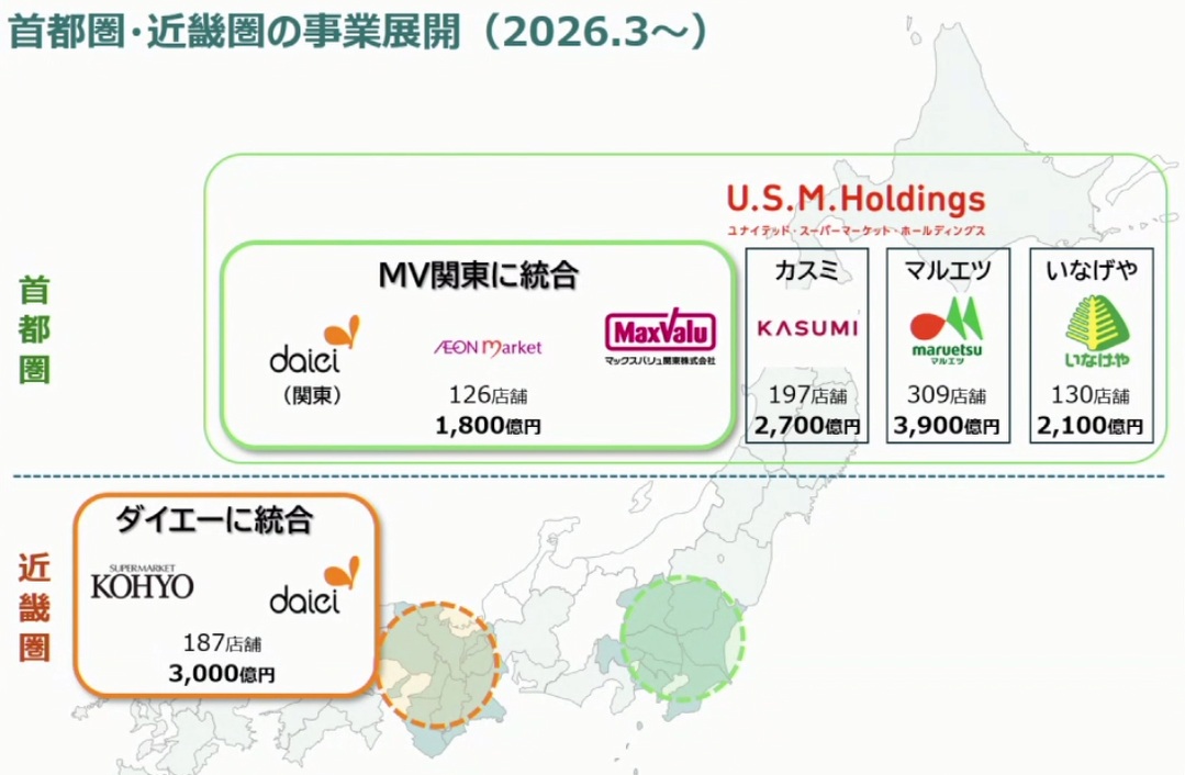 同社のスーパーマーケット事業について、首都圏ではユナイテッドスーパーマーケットホールディングス(U.S.M.H)が展開。これはマックスバリュ(MV)関東、カスミ、マルエツ、いなげやが組織するスーパーの集合体。このうちMV関東にダイエーの関東事業とピーコックストアを展開するイオンマーケットを統合、26年3月1日付で新会社イオンフードスタイルを発足させる。イオンフードスタイルは売上高1800億円、126店舗で、他のU.S.M.H各社の売上を合わせ新生U.S.M.Hは売上高1兆500億円、761店舗となり、国内で最大規模の食品スーパーが誕生する。