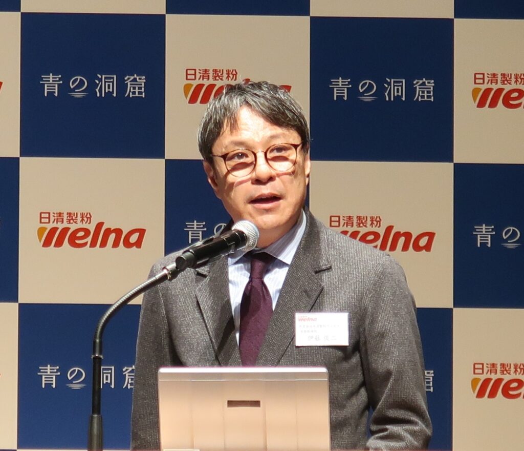 日清製粉ウェルナは2月3日、都内で春の新製品発表会を開催した。発売30周年を迎えた「青の洞窟」のリブランディングを柱に、パスタ市場を取り巻く環境認識、国内外の事業戦略、2026年春の重点商品について説明した。発表会には岩橋恭彦社長、伊藤俊二常務、東雅文取締役商品開発本部長らが登壇した。