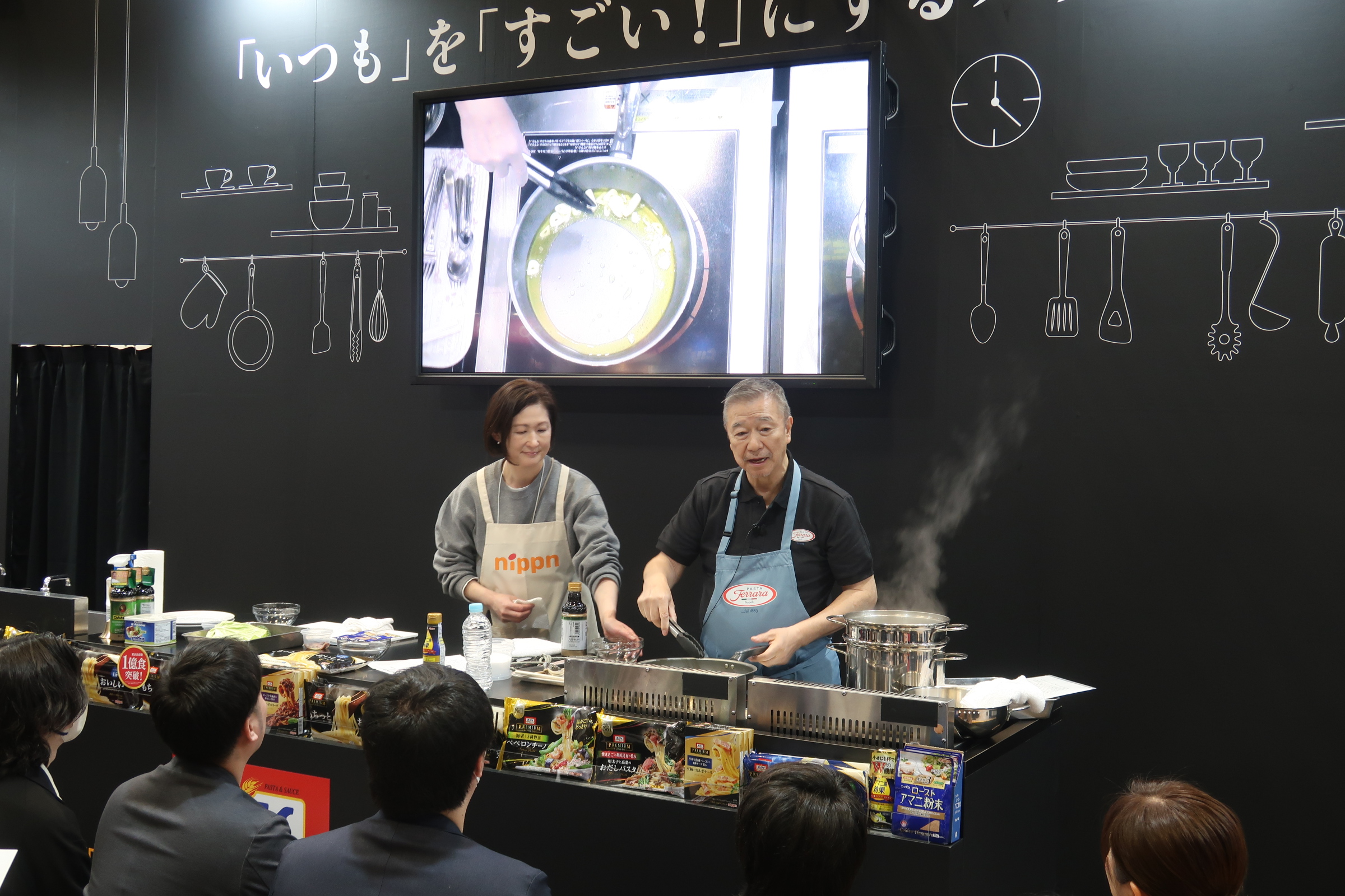 ニップンは「オーマイプレミアム」を中心に展示。冷凍パスタ拡充に加え、落合務氏のクッキングショーが立ち見の出る盛況となり、ブランド力を強く印象づけた。