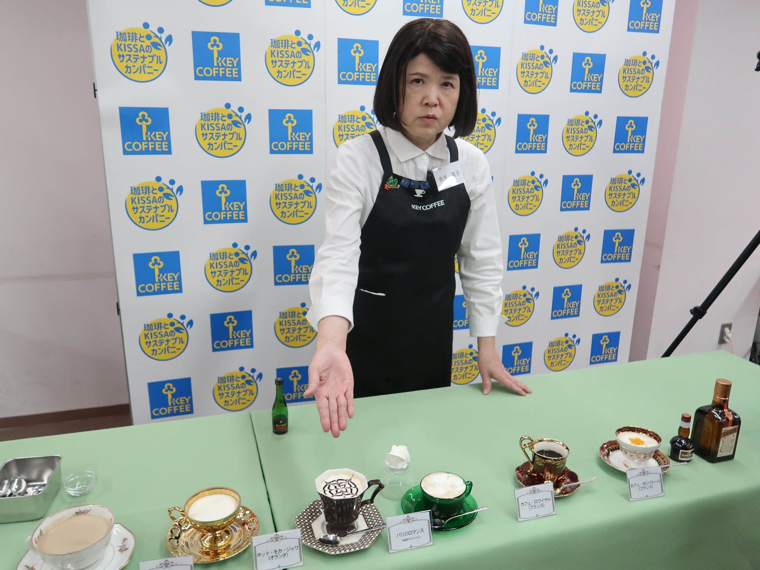 まず、コーヒー教室の金井育子講師が、ネルドリップ抽出で同社商品「ブレンドコーヒーNo.60」をウェルカムコーヒーとして提供すると、喫茶店の国内外での歴史、メニューを説明。世界のアレンジコーヒーとして、カフェ・オ・レ、カフェ・ロワイヤル、カフェ・ポンパドール(フランス)、ウインナ・コーヒー(オーストリア)、ホット・モカ・ジャワ(オランダ)、パリのロマンス(コーヒー教室初代室長の髙島君子氏考案)も実演し、参加者は試飲も楽しんだ。