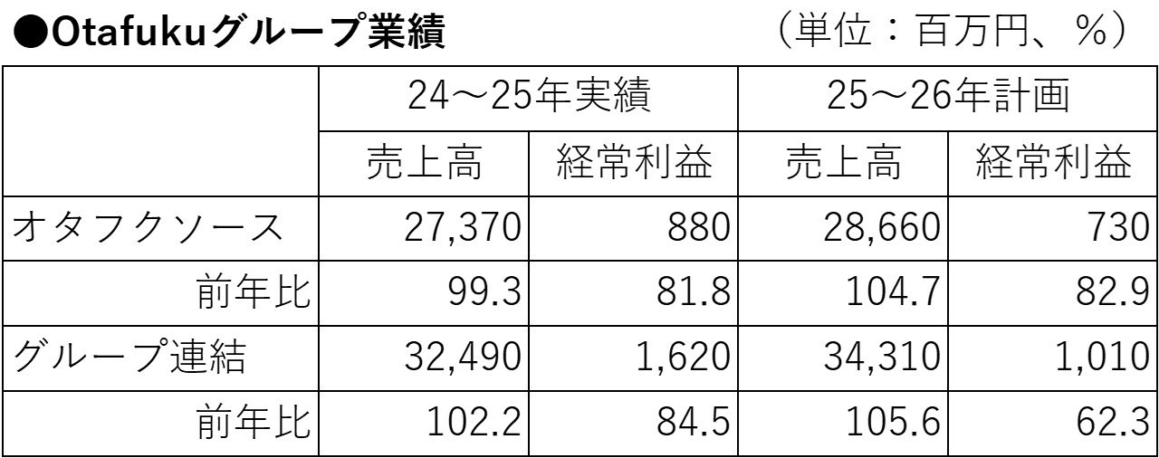 続いて、オタフクソースの佐々木孝富社長が登壇。業績および第5次中期経営計画(24~28年度)の進捗を説明した。25年度の単体業績は総売上高273億7000万円(前年比99.9%)、経常利益8億8000万円(81.8%)。グループ連結では総売上高324億9000万円(102.2%)、経常利益16億2000万円(84.5%)となった。海外事業売上が64億円(114.3%)と好調で、成長をけん引した。