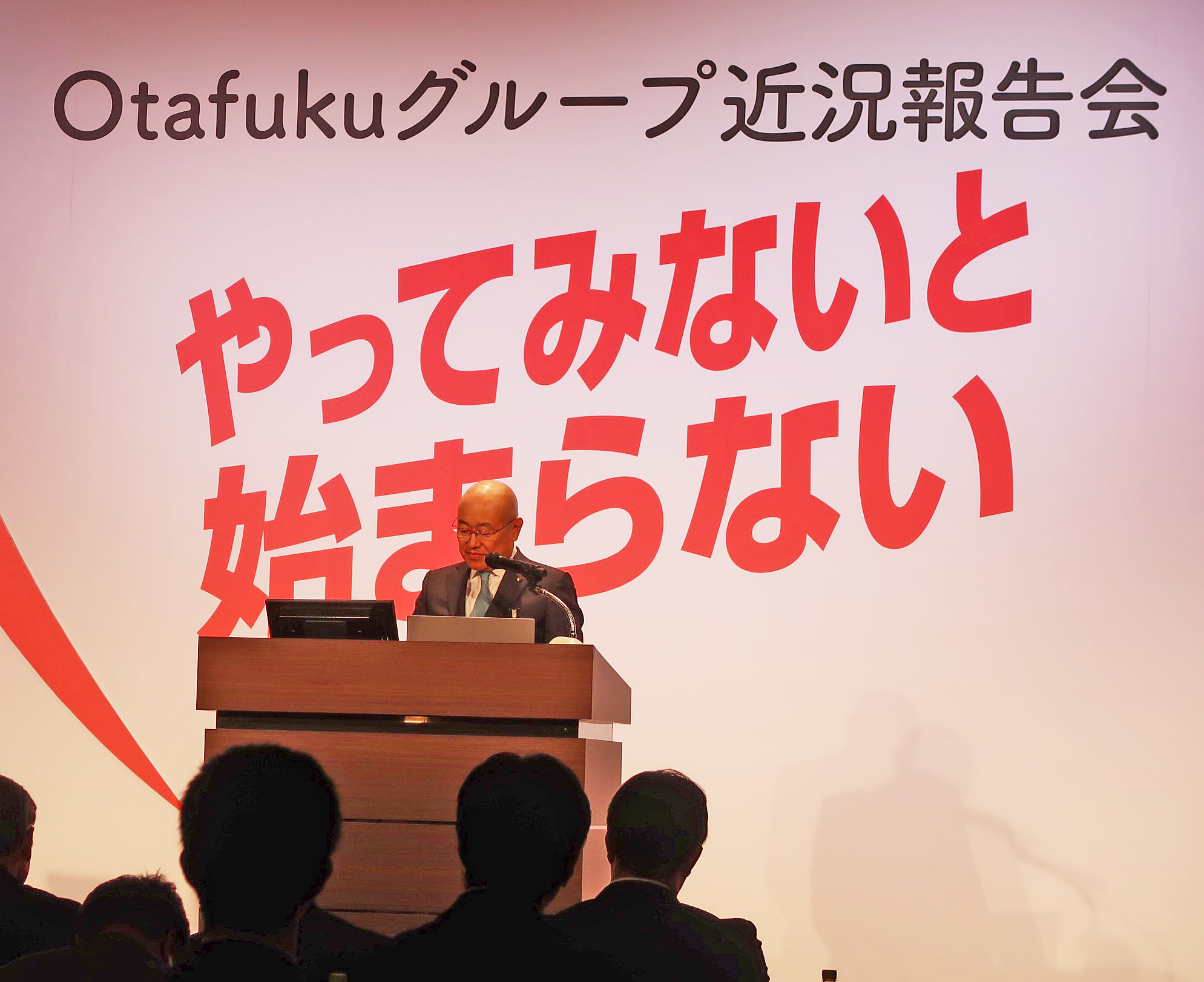 冒頭、オタフクホールディングスの佐々木直義社長が挨拶=写真。25年度の業績について「増収減益で着地した」と報告。アメリカ、中国、マレーシアを中心に海外事業が2ケタ伸長したことを増収要因に挙げ、「グローバル化の中で地盤が着々と築かれている」と今後の成長に期待を寄せた。一方で、原材料やエネルギーなどのコスト増、野菜価格の高騰が減益要因となった。