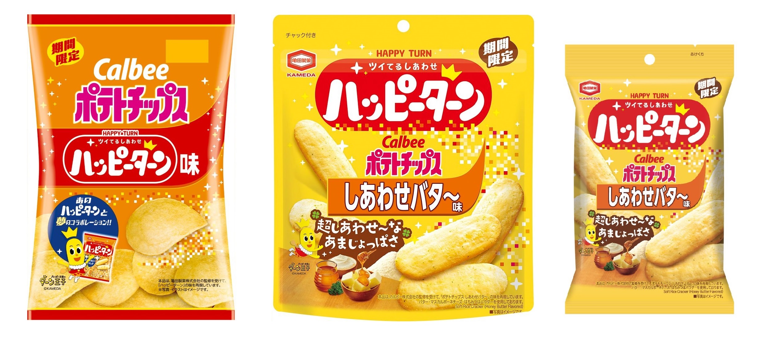 今後、スーパーの店頭では共通の販促物による売り場作りを計画。JR東京駅地下の「東京おかしランド」(東京都千代田区)では、カルビーのアンテナショップ「カルビープラス」で「揚げたてポテトチップス ハッピーターン味」(税込490円)、「同 ソフトクリームと食べる、ハッピーターン味」(600円)、亀田製菓のアンテナショップ「カメダセイカ」で「超ハッピーターン パウダーマニア しあわせバタ~味」(600円)を、それぞれ10月20日から発売する。