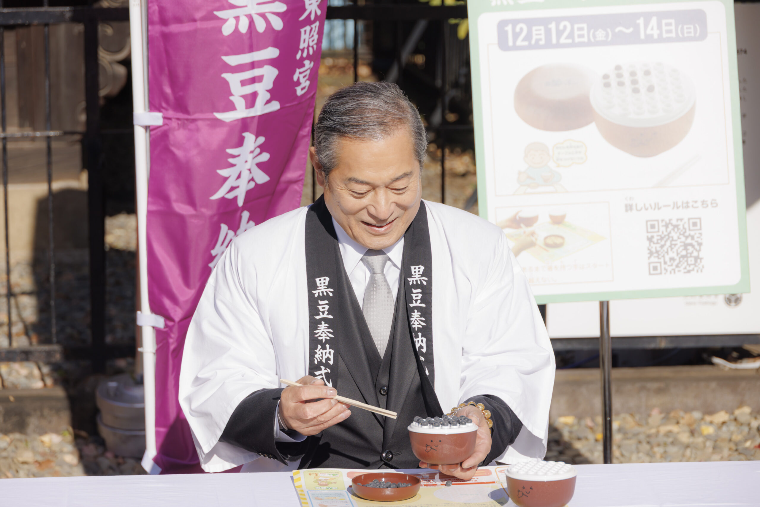 奉納式後は、参拝者を対象に黒豆の試食提供やゲーム体験を実施。松平氏から直接ふるまいを受けた来場者からは「会えて嬉しい」「元気が出た」といった声が上がった。